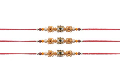 *Each Rakhi is sold individually. Price shown is for one Rakhi* Beautiful Gemstone Rakhi’s, to embellish your brother’s wrist with this sacred thread of protection. Handcrafted with a golden metal beads adorned with Silver, Green & Red gemstones, between two clusters of wooden beads along with various shaped coloured beads, make it stand out, on a long & strong Maroon, Red or Orange cotton thread so you can tie the perfect knot on the special occasion of Raksha Bandhan. A perfect gift to show you love to you dear brothers. Raksha Bandhan is that one hindu celebration which only comes once a year and is dedicated to our dear brothers and sisters. These beautiful and unbreakable cotton threads/rakhi marks and upholds that special bond between a brother and sister. Due to background and lighting the colours may be slightly different; and due to the hand-made nature, this product may have slightly non-uniformed colour or texture.