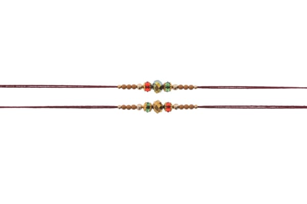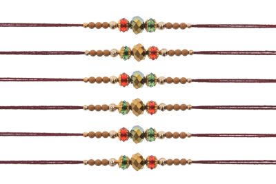 *Each Rakhi is sold individually. Price shown is for one Rakhi* Beautiful Metallic Rakhi’s, to embellish your brother’s wrist with this sacred thread of protection. Handcrafted with a golden metallic bead, between a red & green bead along with various shaped coloured beads, make it stand out, on a long & strong Maroon cotton thread so you can tie the perfect knot on the special occasion of Raksha Bandhan.