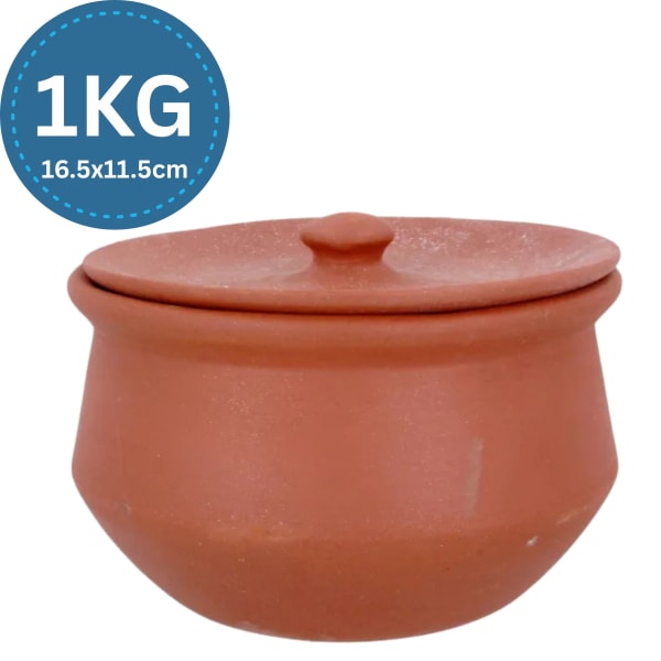 Dimensions of this Clay Handi Serving Casserole are - 1KG (Diameter: 16.5cm & Height: 11.5cm).